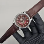 - Burgundy dial featuring world city time zones for global timekeeping.